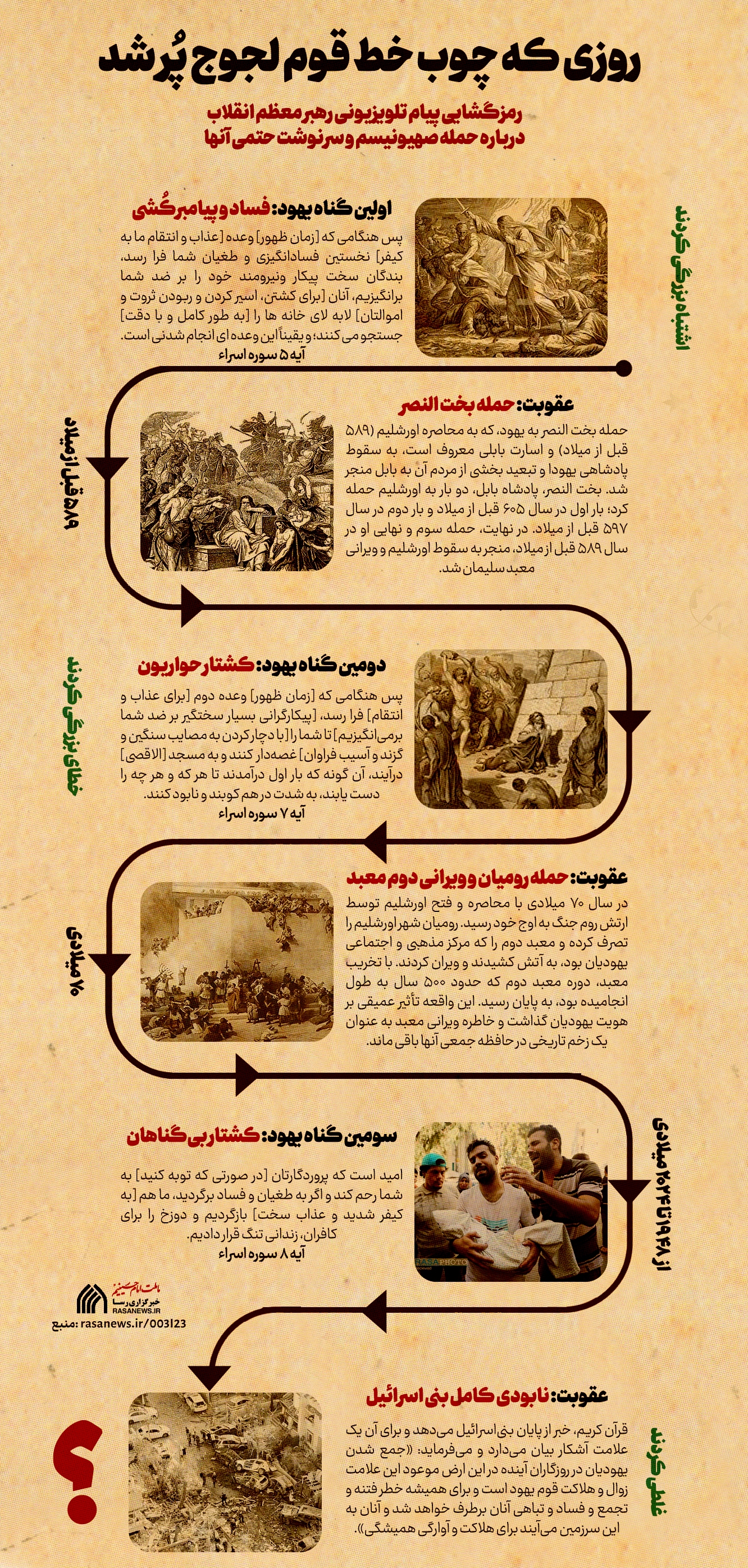 در این اطلاع نگاشت به بررسی اجمالی و رمزگشایی پیام تلویزیونی رهبر معظم انقلاب درباره حمله صهیونیسم و سرنوشت حتمی آنها طبق آیات قرآن میپردازیم.