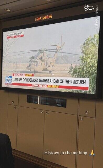 «دونالد ترامپ» رئیس جمهور آمریکا از هواپیمایش در مسیر اراضی اشغالی در حال تماشای آزادی زندانیان صهیونیست است.