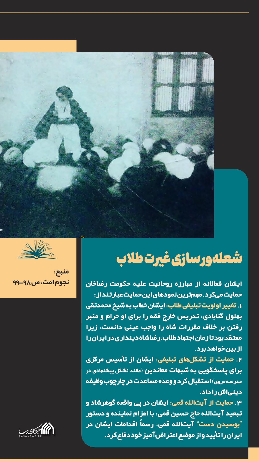 آیتالله سیدابوالحسن اصفهانی (ه) در دوران سیاستهای سرکوبگرایانه رضاشاه، یکی از ستونهای مقاومت دینی بود. ایشان با صدور فتاوای تاریخی، مبارزه را به واجب عینی تبدیل کردند و با هدایت طلاب و حمایت از تشکلهای مذهبی، در حفظ دین در برابر تجدد اجباری نقشی کلیدی ایفا نمودند. الگوی عملی ایشان، فقاهت متعهد و اولویت دادن به روشنگری دینی بود.