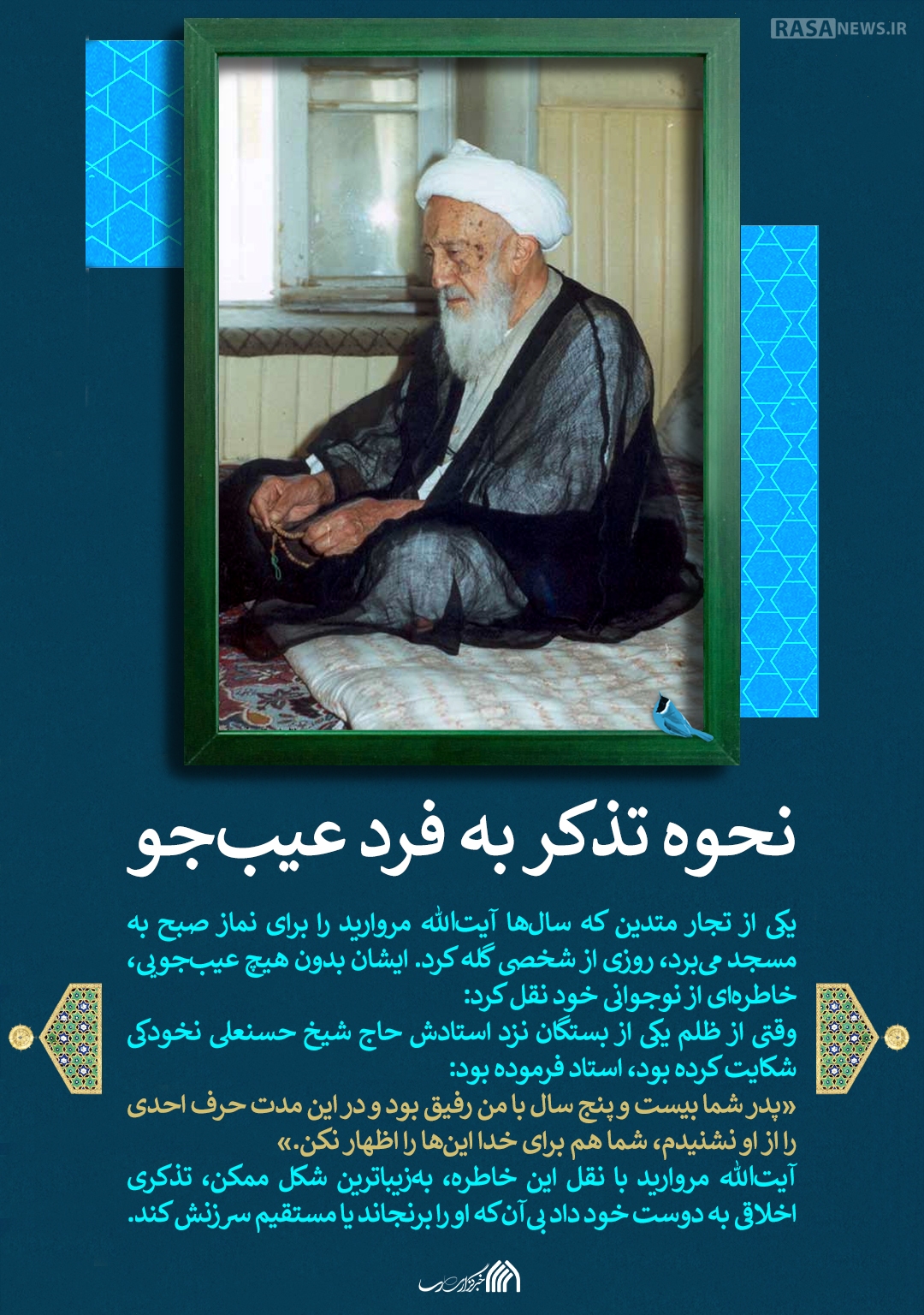 در مجموعه پوستر "سیره علما" که به طور روزانه منتشر خواهد شد، به سیره اخلاقی و اجتماعی علما و اعاظم حوزوی میپردازیم. در این قسمت به ذکر خاطرهای از مرحوم آیتالله حسنعلی مروارید از علمای برجسته و اخلاقمدار حوزه علمیه مشهد میپردازیم.