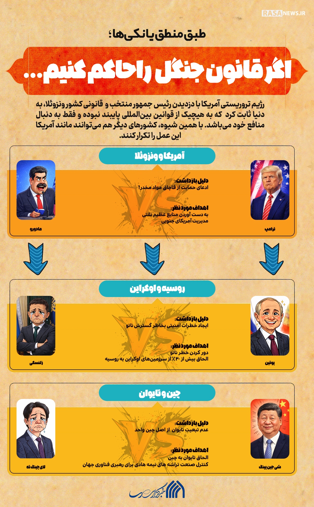 رژیم تروریستی آمریکا با دزدیدن رئیس جمهور منتخب و قانونی کشور ونزوئلا، به دنیا ثابت کرد که به هیچیک از قوانین بین‌المللی پایبند نبوده و فقط به دنبال منافع خود می‌باشد. با همین شیوه، کشور‌های دیگر هم می‌توانند مانند آمریکا این عمل را تکرار کنند.