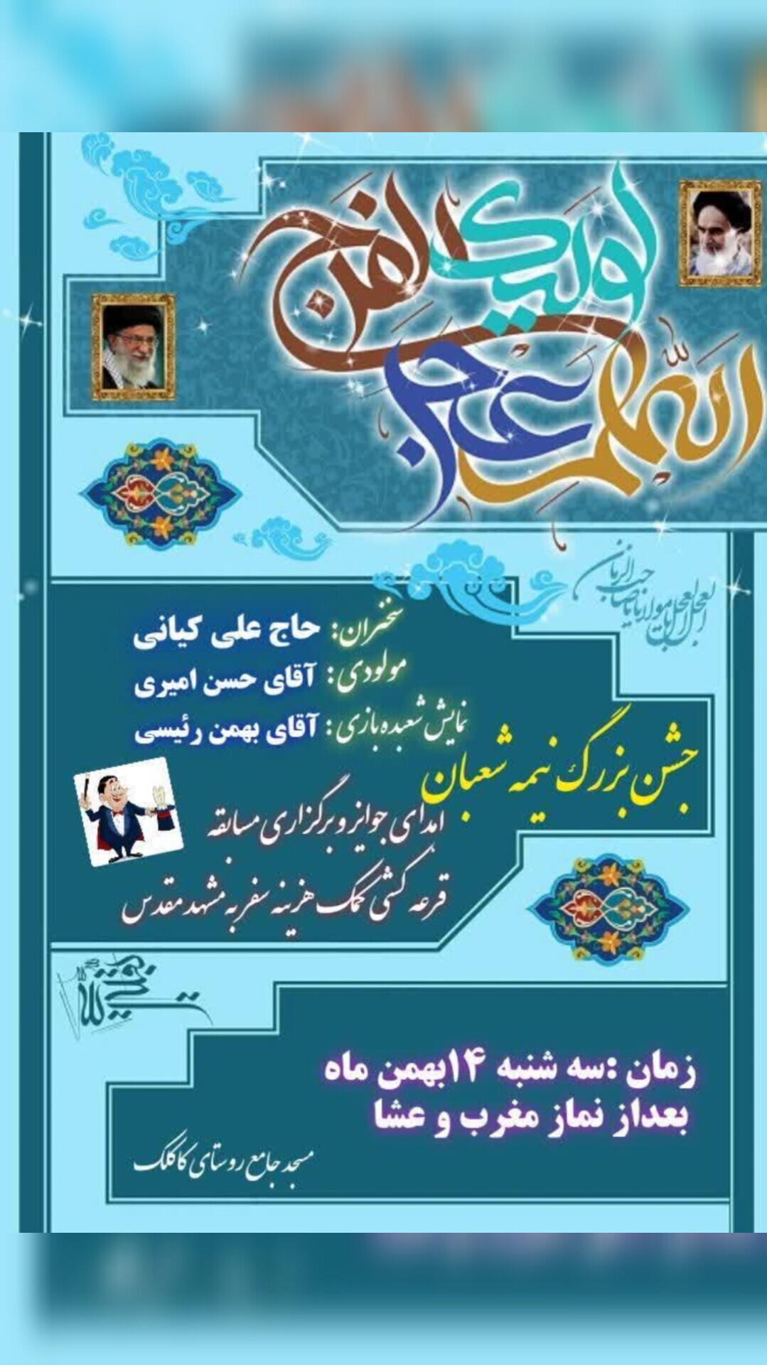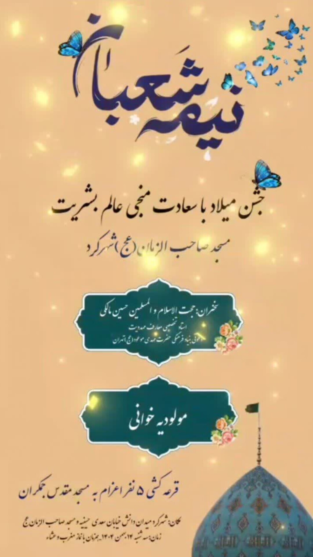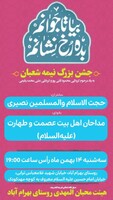 چهارمحال و بختیاری - همزمان با فرا رسیدن نیمه شعبان، سالروز ولادت با سعادت امام زمان(عج) برنامه‌های جشن و سرور و سخنرانی در مساجد و هیئات مذهبی استان چهارمحال و بختیاری برگزار می‌شود.